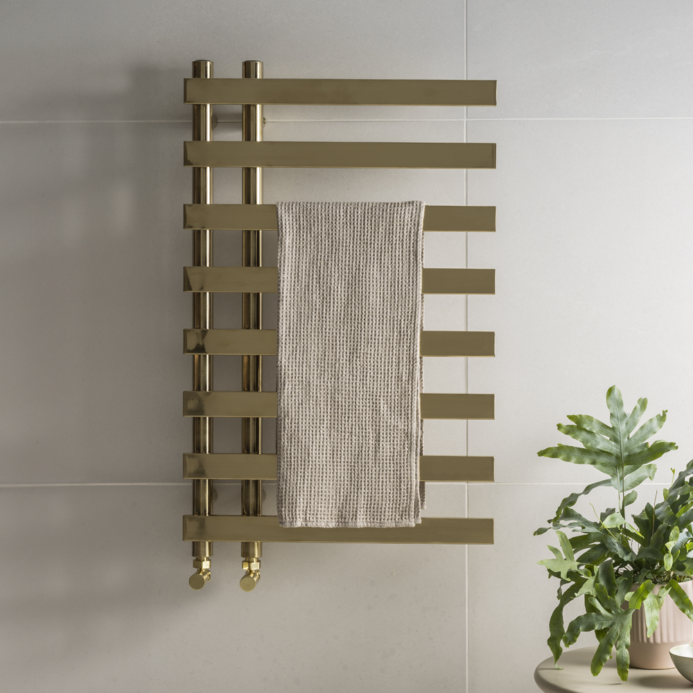 Create an instant focal point in your bathroom with the Arezzo 800 x 500mm 8-bar designer towel rail, featuring a bold design that provides plenty of space for all your towels, keeping them gently warm. Manufactured from durable steel with a high-quality brushed brass finish, this stylish designer towel rail offers superb heat output to keep your towels and bathroom or cloakroom cozy.