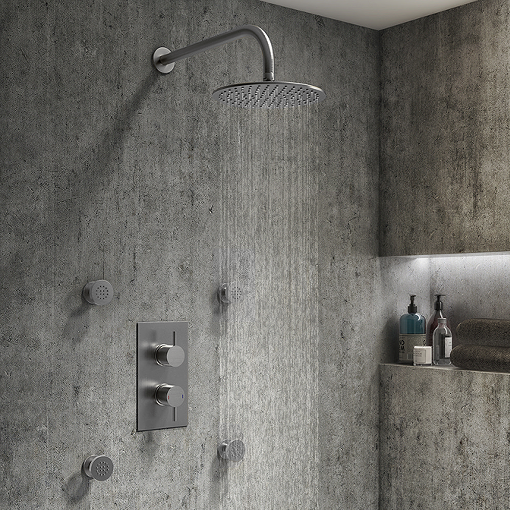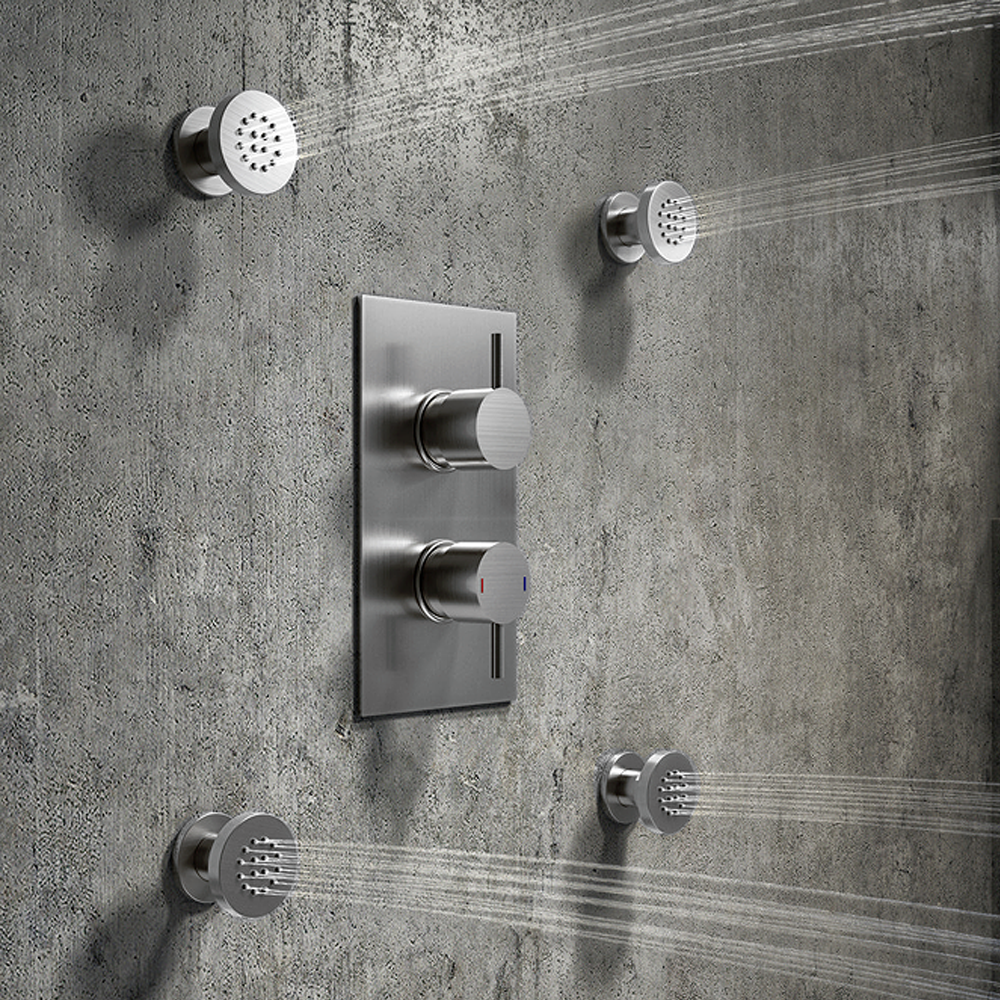 A stylish, adjustable, anti-limestone flat round body jet with nozzles, the Arezzo body jet is constructed from durable brass with a quality brushed gunmetal grey-plated finish. Shower body jets add a luxurious touch to your shower, perfect for creating a massaging experience. Although sold individually, body jets are typically used in sets of four or six and require high flow rates when used in conjunction with an overhead shower.