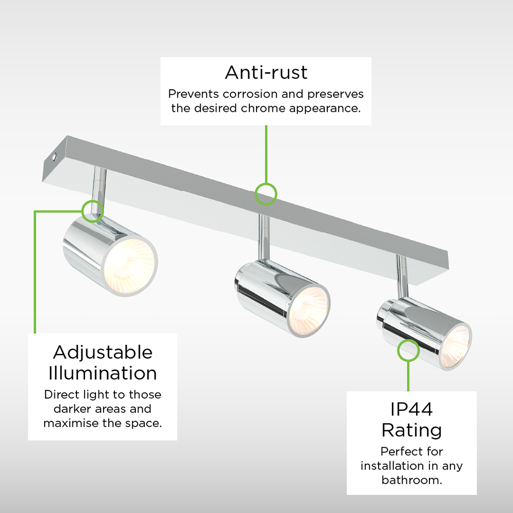 The Ellis & Co 3 Light Bar is designed especially for the bathroom, this triple spotlight features three adjustable lights which are finished in Chrome, the 3 light bar bathroom spotlight will add a touch of elegance to your Bathroom, Once illuminated it gives a beautiful glow to illuminate your bathroom perfectly. The product comes with a 5-year warranty.