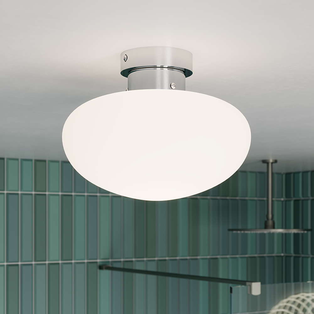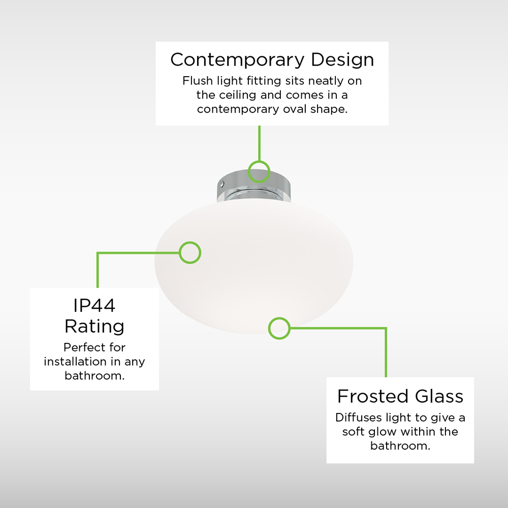 The Ellis & Co Oval ceiling light is finished in chrome and designed especially for the bathroom. This ceiling light has a flush ceiling installation and has a chrome base and a frosted glass diffuser giving off a soft glow of illumination in your room. The product comes with a 5-year warranty.