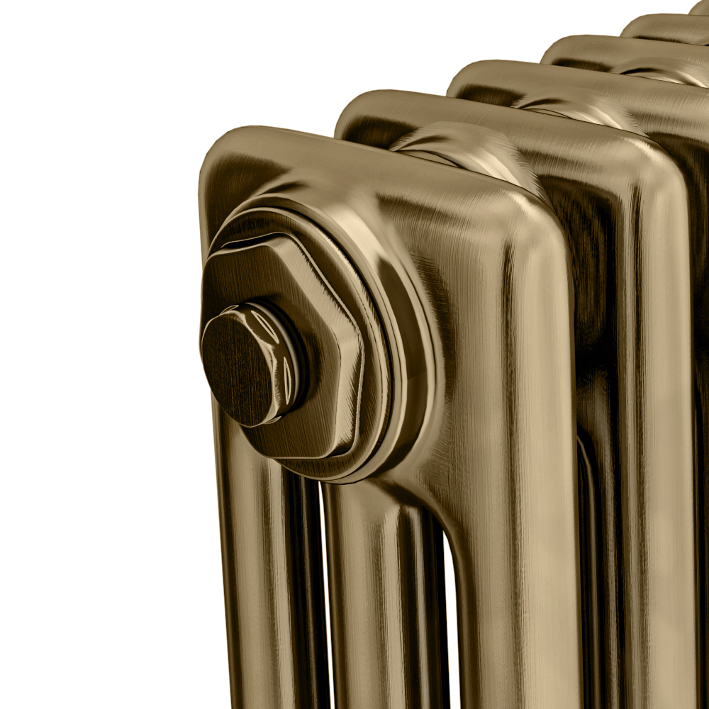 Introducing the Keswick 600 x 425 Horizontal Cast Iron Style Radiator in Antique Brass Effect. This stunning radiator combines vintage charm with modern functionality, making it the perfect addition to any home. With its 3 column design and sections, it not only provides efficient heating but also adds a touch of elegance to your space. The antique brass effect finish enhances its classic appeal, creating a timeless and luxurious look. Whether you are renovating a period property or simply want to add a touch of character to your modern home, the Keswick radiator is the ideal choice. Experience warmth and style like never before with this exquisite cast iron style radiator. To complete the classic look, pair this traditional column radiator with some elegant Traditional Antique Brass Radiator Valves sold separately.